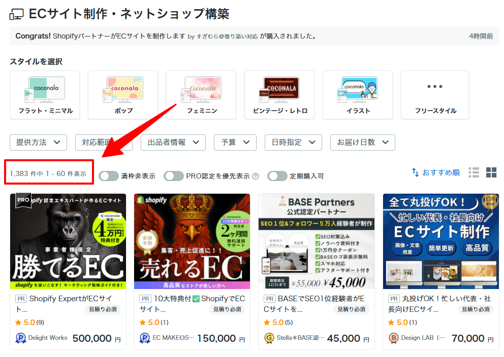 例えば、クラウドソーシングサービスの「ココナラ」で出品数を見てみると、
