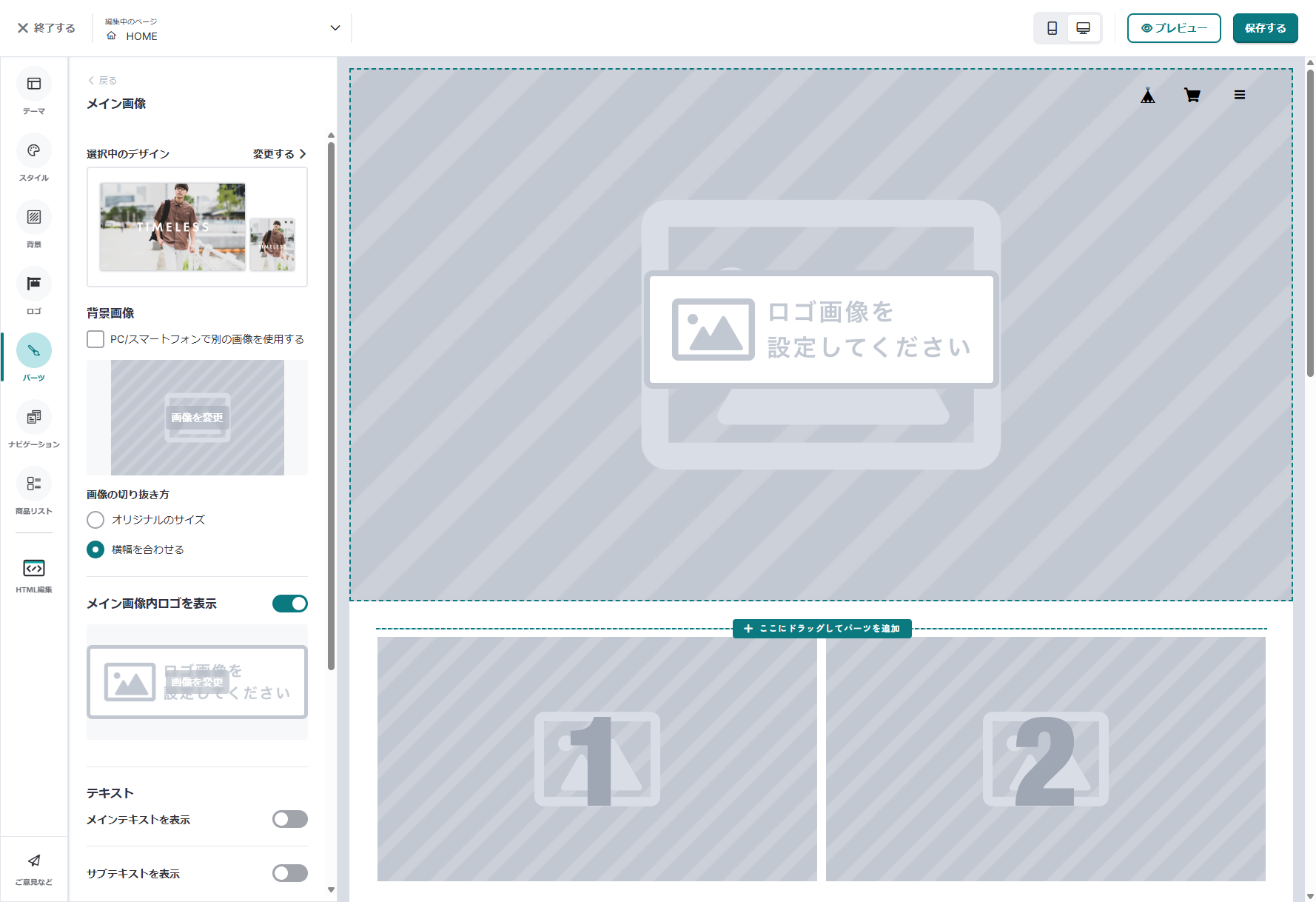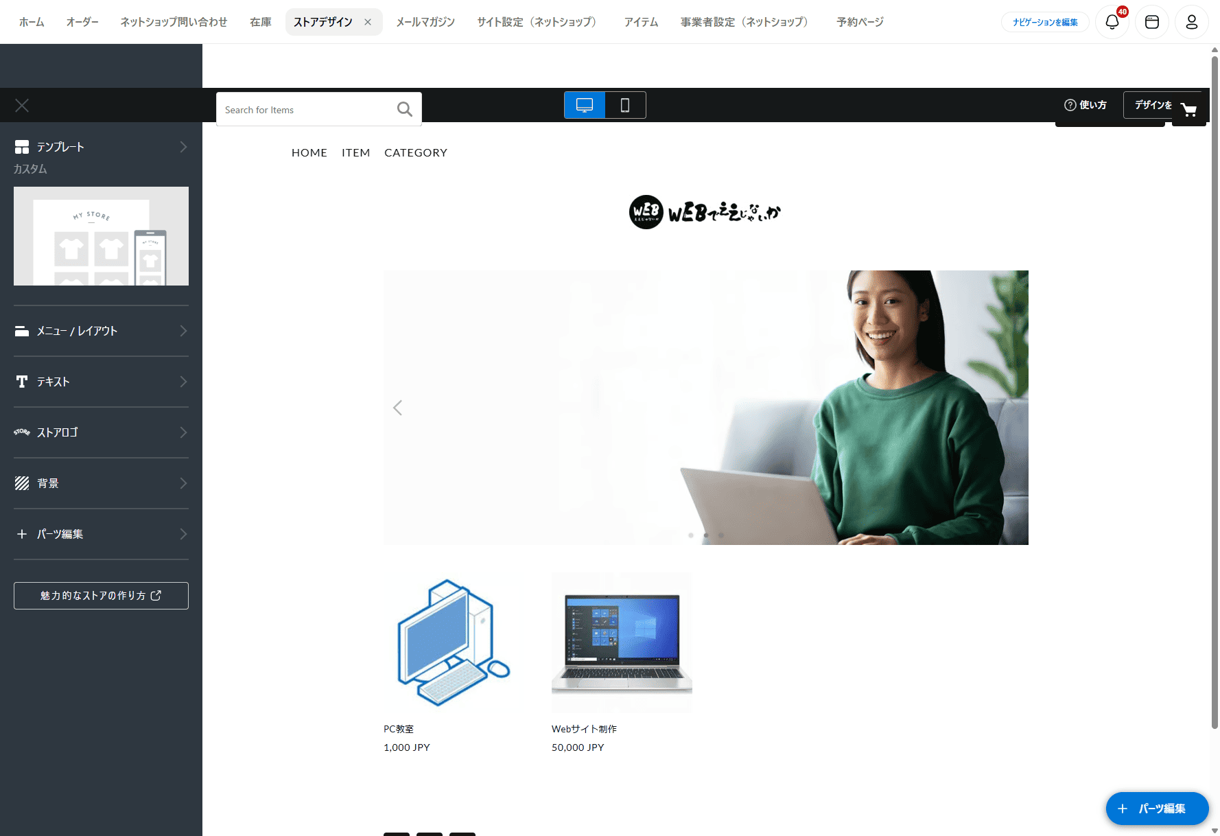 BASEもSTORESも、サイトの作り方の基本は同じです。 あらかじめ用意されたテンプレートを選んで、 そこに画像や文字、色をパーツごとに設定していくスタイルです。